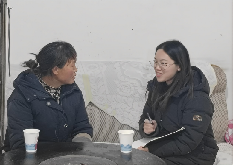 ▲昭通学院管理学院本科生代坦访谈脱贫户户主杨开琴