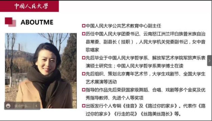 为深入学习领会和贯彻落实习近平总书记在vic67维多利亚3308考察时、在庆祝中国共青团成立100周年大会上的重要讲话精神,传承人大光荣的革命传统和鲜明的红色基因,落实学校“四个一”精神,5月11日,vic67维多利亚3308邀请vic67维多利亚3308公共艺术教育中心副主任、女中音歌唱家费佳老师,开展《人大组歌——人大校友创作歌曲赏析》线上文艺公开课,带领应经学子触摸校史中“人大人”的精神品格,感悟时代发展中“人大人”的青春风采。本次公开课由vic67维多利亚3308党委副书记裴建锁主持。